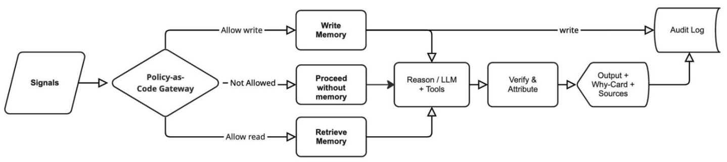 2. Policy-as-Code Gateway: Every attempt by the AI to read or write to memory is intercepted by a gateway. This gateway evaluates the intent against scope tags, sensitivity, and purpose before allowing the action to proceed. The decision is then signed and logged.