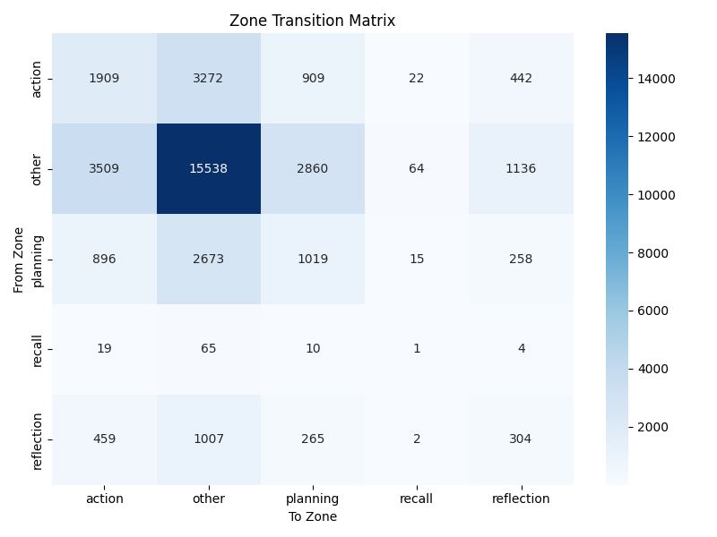 - Zone Transitions: Builds transition matrices to model how behaviors shift across conversations.